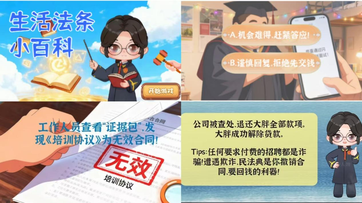 结合普法IP“法小理”设计“决策式”游戏,比如“租房避坑”场景中,用户选择“赶紧答应”或“拒绝先交钱”,会触发不同法律后果视频,同步呈现《中华人民共和国民法典》“格式条款无效”“欺诈行为可撤销”等法条,边玩边学。