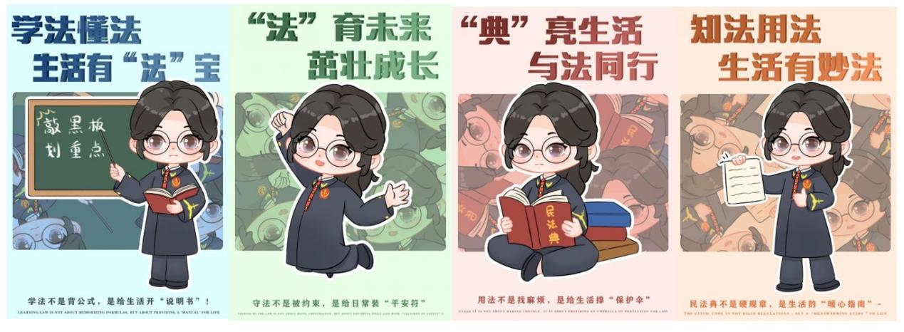以青年传播语境为导向,采用更具网络感与情绪化的视觉语言。通过AI生成与平面延展相结合的方式,制作了一系列以“学法懂法”“生活有法宝”等为主题的视觉作品。