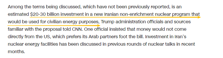 特朗普政府官员和熟悉该方案的消息人士还向CNN透露了此前未曾报道过的细节——讨论的条款之一是对伊朗用于民用能源的非浓缩铀核项目投资约200亿至300亿美元。一位官员坚称,资金不会直接来自美国,美国更希望阿拉伯伙伴买单,“美国愿意主导与伊朗的谈判。而且,建设核计划需要有人出钱,但我们不会做出这样的承诺。”