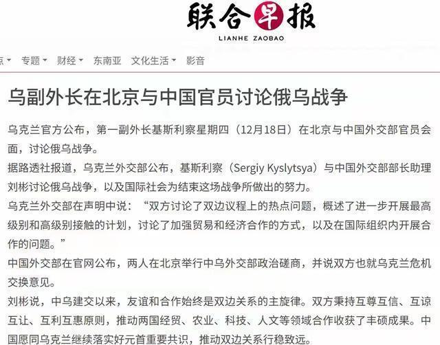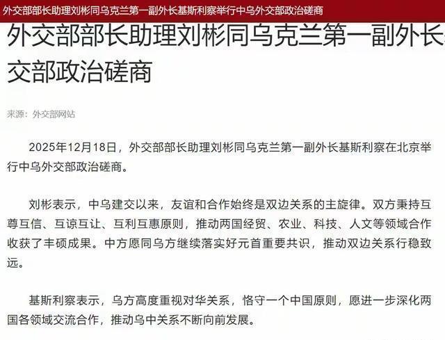 根据中国外交部发布的消息,12月18号,咱们的外交部部长助理刘彬,跟乌克兰的第一副外长基斯利察在北京见了面。会上,中方照例说了些“友谊与合作是主旋律”的话,强调两国在农业、经贸这些方面合作得不错。
